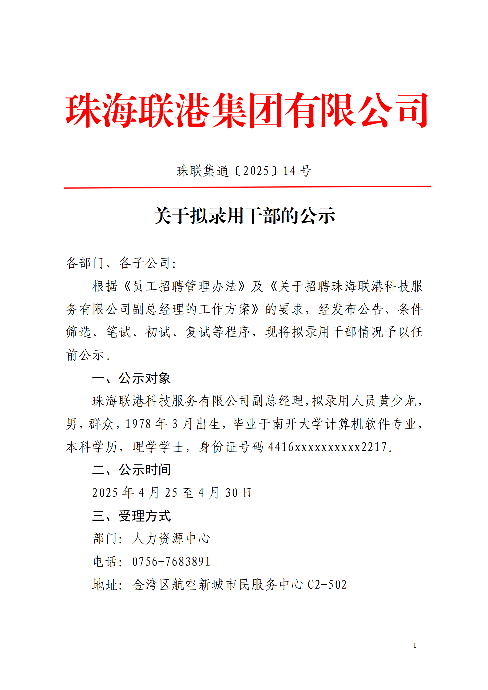 珠聯(lián)集通〔2025〕14號(hào) 關(guān)于擬錄用干部的公示