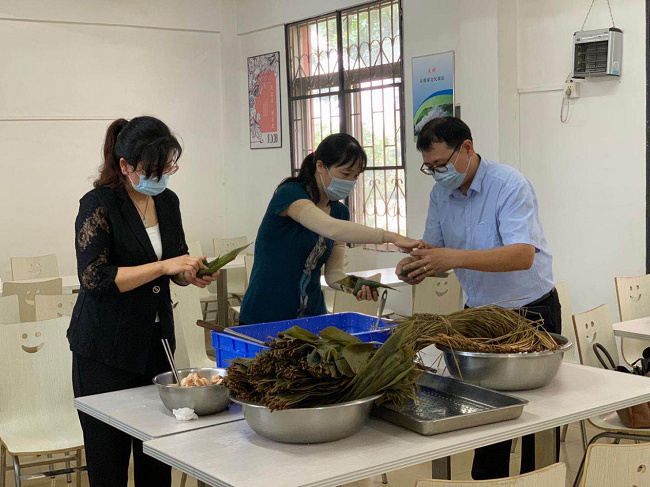 活動(dòng)現(xiàn)場準(zhǔn)備了糯米、粽葉、板栗、蛋黃等材料,大家圍在一起,從嘗試、普及到大展身手,歡聲笑語、棕葉飄香,參與人員包得不亦樂乎。