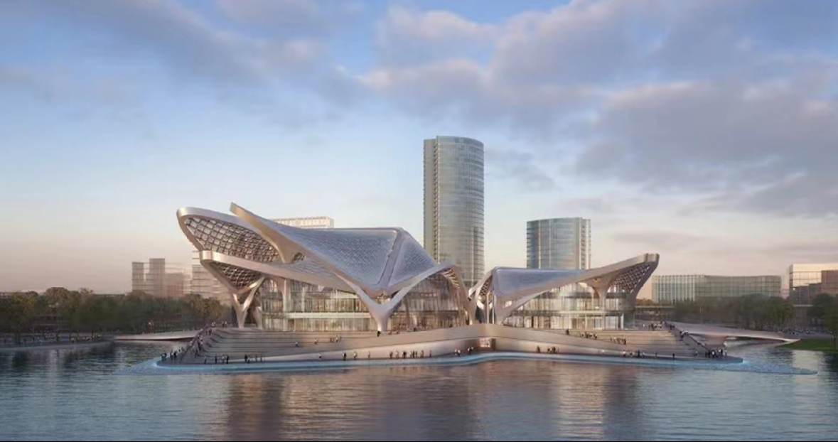 扎哈遺作,金灣地標(biāo)。金灣航空城市民藝術(shù)中心位于金灣航空城中心湖正中心,四面濱水,金帆大道下穿而過。總建筑面積99582.39平方米,共有四棟建筑物,分別為1200座的大劇院、500座觀眾的多功能廳、4000多平方米的藝術(shù)館、7000多平方米的科普館。